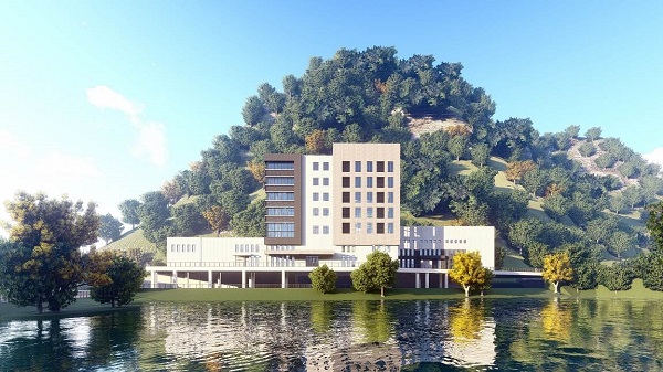 四川鄉(xiāng)城水電站基地工程總用地面積約20842平方米,總建筑面積13578平方米,規(guī)劃布局中因地制宜的將建筑群圍繞橢圓型中心廣場布局,主要建筑取南北向為主要朝向。建筑群的主要功能包括辦公樓、后勤樓、高管宿舍、宿舍樓四部分。