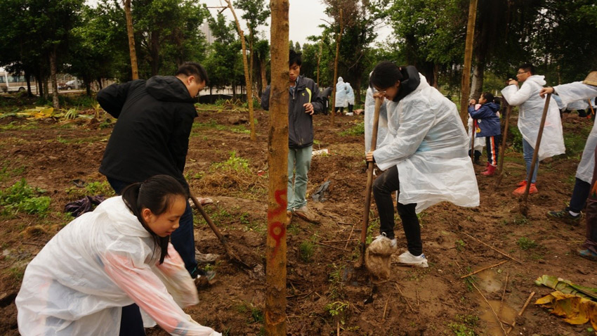 好雨知時節,當春乃發生?;顒赢斕煜缕鹆司d綿細雨,但大家熱情不減,穿上雨衣套上雨鞋,興致勃勃地揮舞著鐵鏟、揮灑著汗水。團結力量大,一顆顆樹苗很快就在歡聲笑語中立了起來。