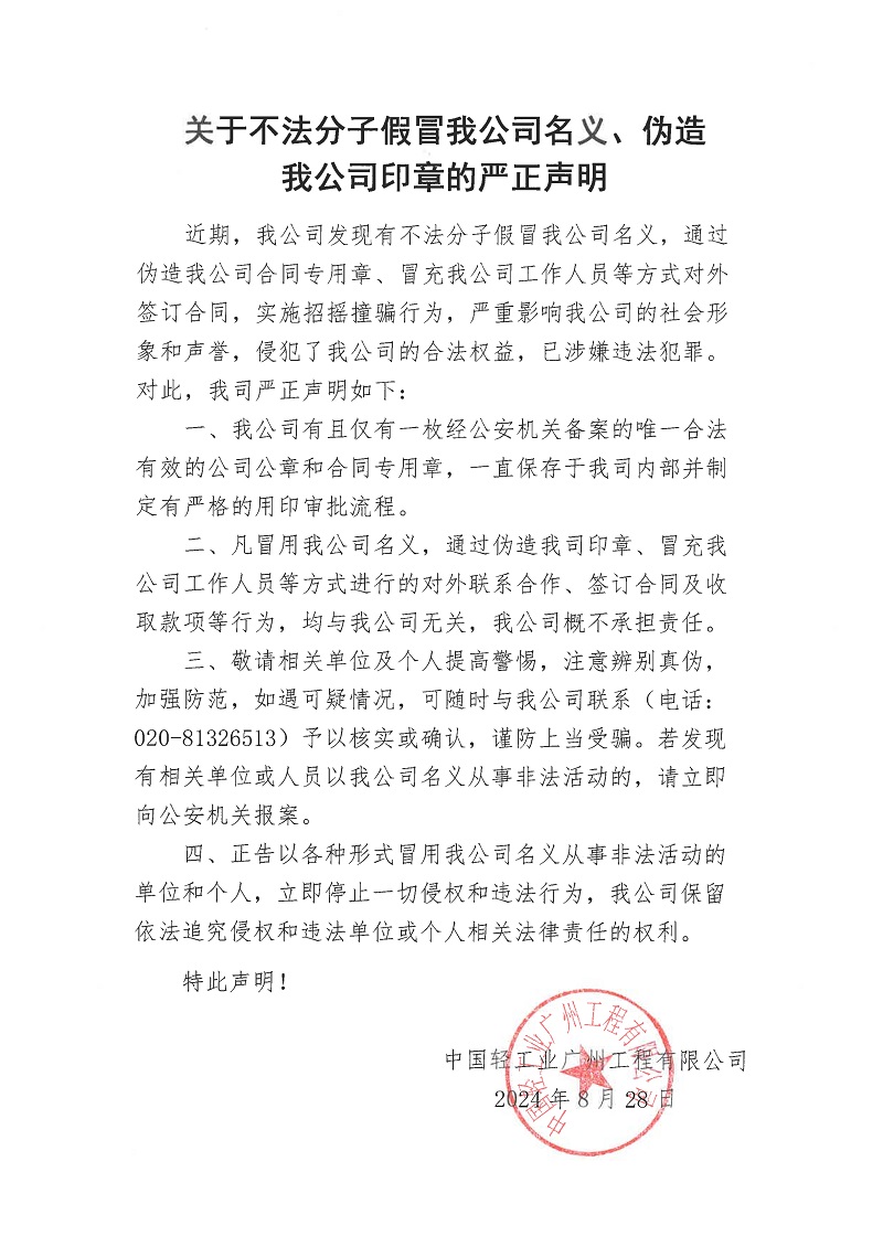關于不法分子假冒我公司名義、偽造我公司印章的嚴正聲明 發(fā)布日期:2024/08/29
